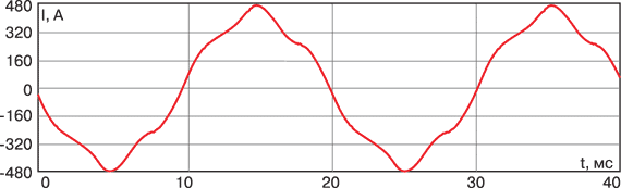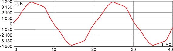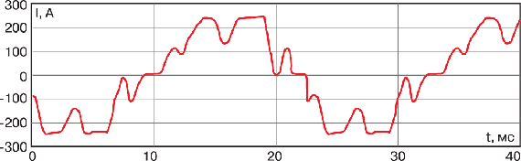 АИТ с параллельными конденсаторами имеет достаточно «гладкие» формы выходных тока и напряжения (осциллограмма на рис. 4 снята при номинальной нагрузке электропривода 1570 кВт, 3300 В).
