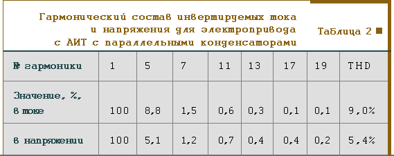 Гармонический состав инвертируемых тока и напряжения для указанных выше условий приведен в табл. 2.