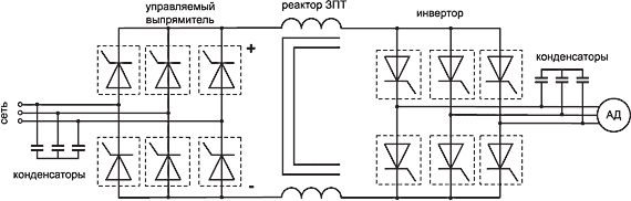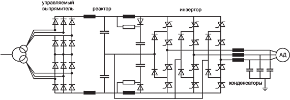 На рис. 5 приведена типичная схема ВПЧ на основе АИТ с ШИМ. Другие схемы отличаются только схемой управляемого выпрямителя. Применение ШИМ позволило получить близкие к синусоидальной формы инвертируемых тока и напряжения, поскольку конденсаторный фильтр на выходе инвертора, поглощая высокочастотные гармоники, обеспечивает формирование в двигателе квазисинусоидальных тока и напряжения.
