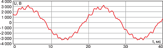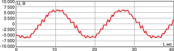 Осциллограмма на рис. 2, снятая на электроприводе ЭТВА питательного насоса ТЭС, иллюстрирует формы тока в фазе и линейного напряжения статора асинхронного двигателя при частоте порядка 32 Гц.