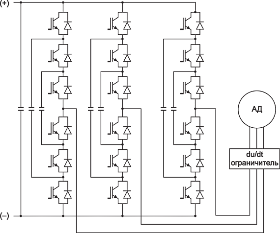 Интересное решение было найдено Alstom и General Electric. Это решение основано на четырехуровневой форме (4-level) выходного напряжения, для чего пришлось изменить топологию АИН, как показано на рис. 9. Инверторы ВПЧ ALSPA VDM 6000 Alstom выполнены на IGBT, а инверторы ВПЧ Innovation Medium GE выполнены на IGCT.